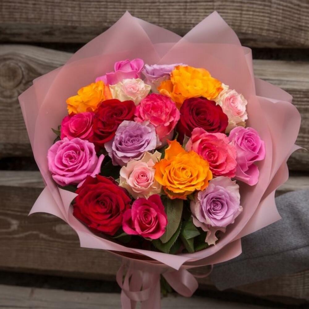Multicoloured roses in stylish matte wrap film. Recipients will definitely appreciate these long-lasting roses.
