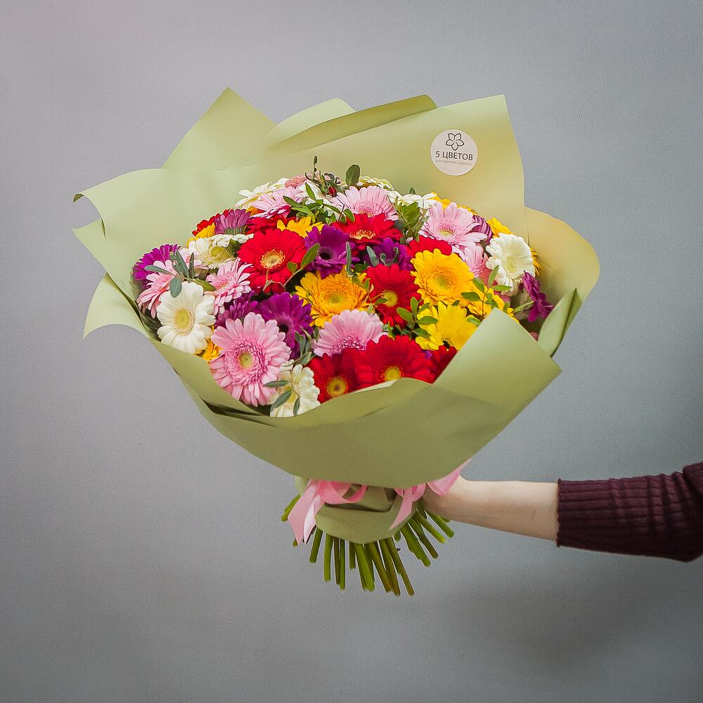 Гербера желтая – 13 шт.Гербера белая – 13 шт.Гербера розовая – 15 шт.Гербера красная – 10 шт.зелень салал – 1 шт.