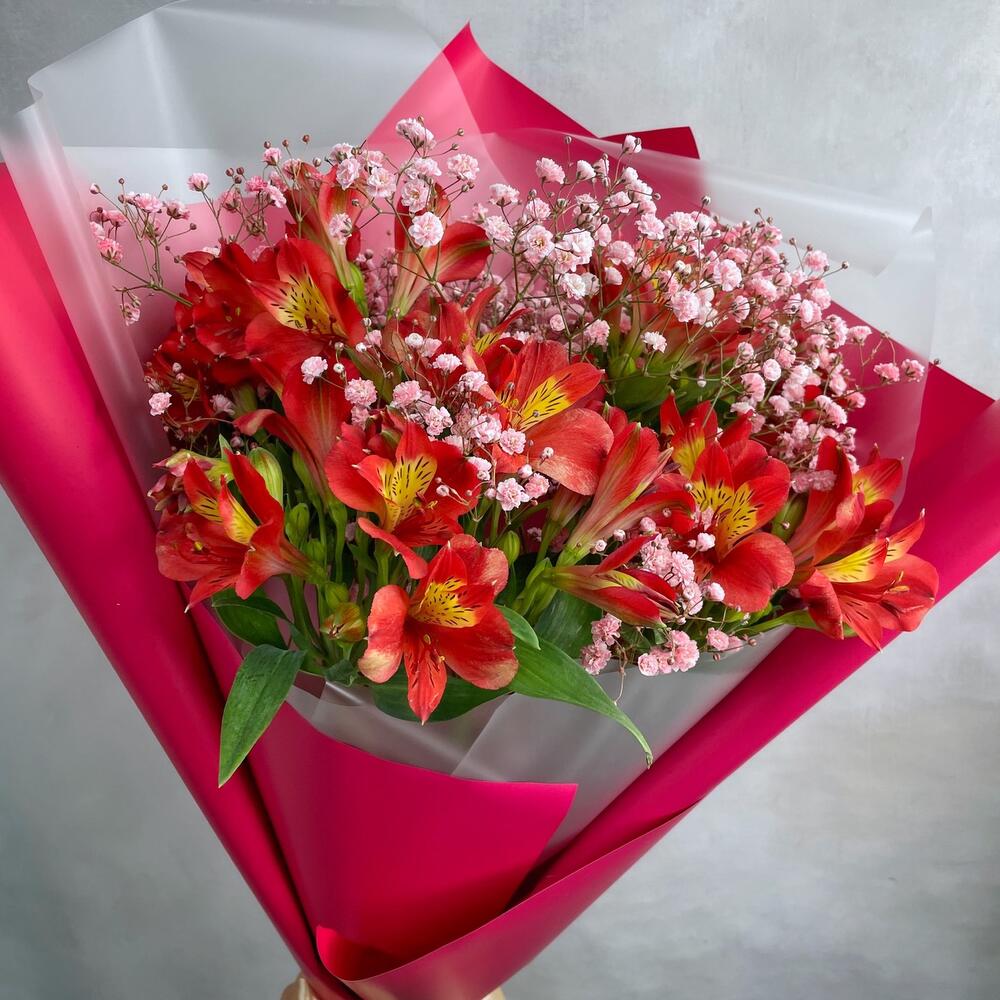 Альстромерия – 7 шт.Гипсофила – 2 шт.Упаковка пленка матовая – 2 шт.