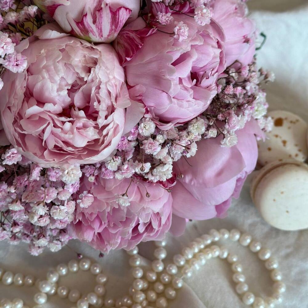 Лента репсовая – 1 шт.Средство для продления жизни цветов – 1 шт.Гипсофила розовая – 7 шт.пионы розовые – 7 шт.