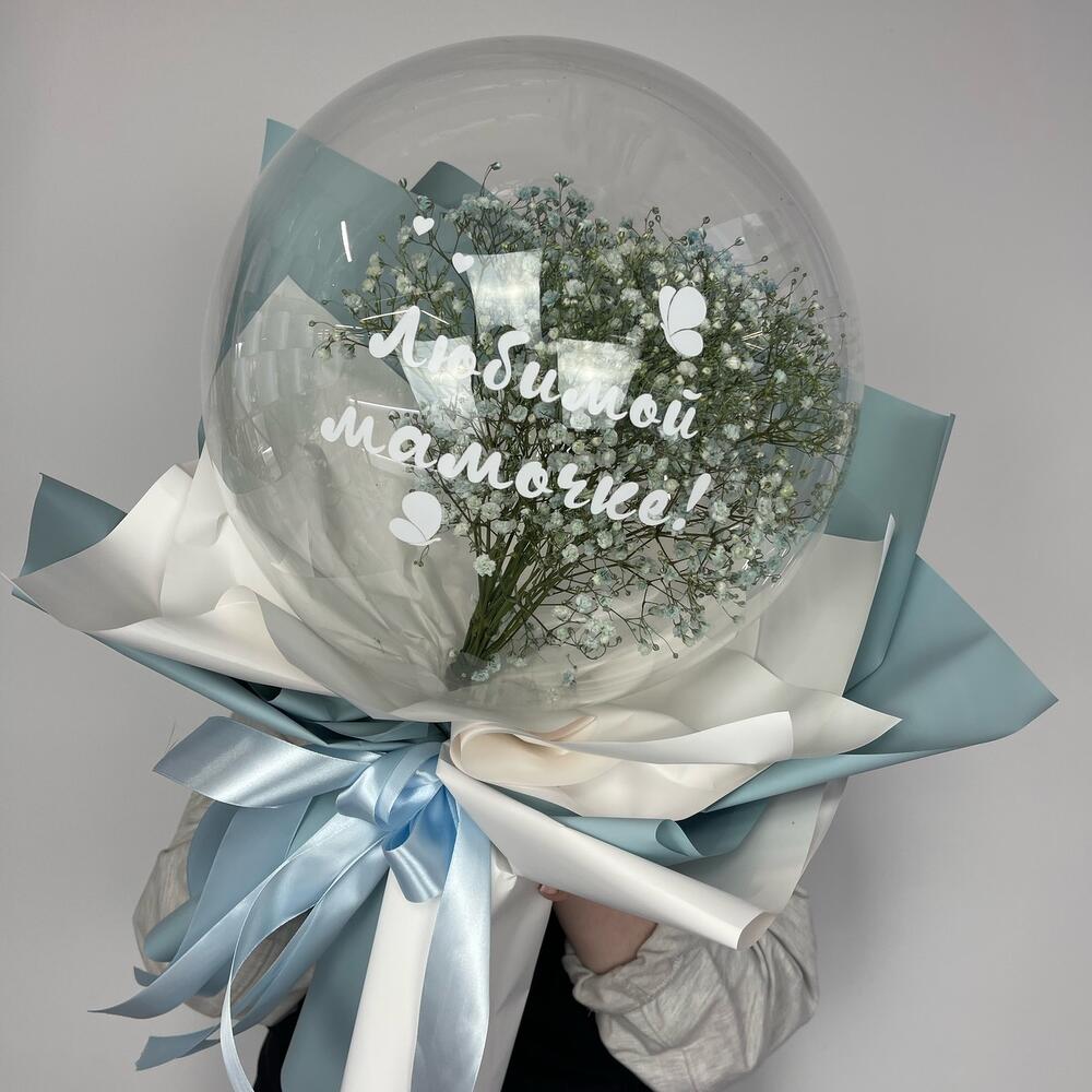 шар бабл – 1 шт.Гипсофила – 3 шт.наклейка фирменная – 1 шт.покнка матовая – 6 шт.Лента атласная – 4 шт.