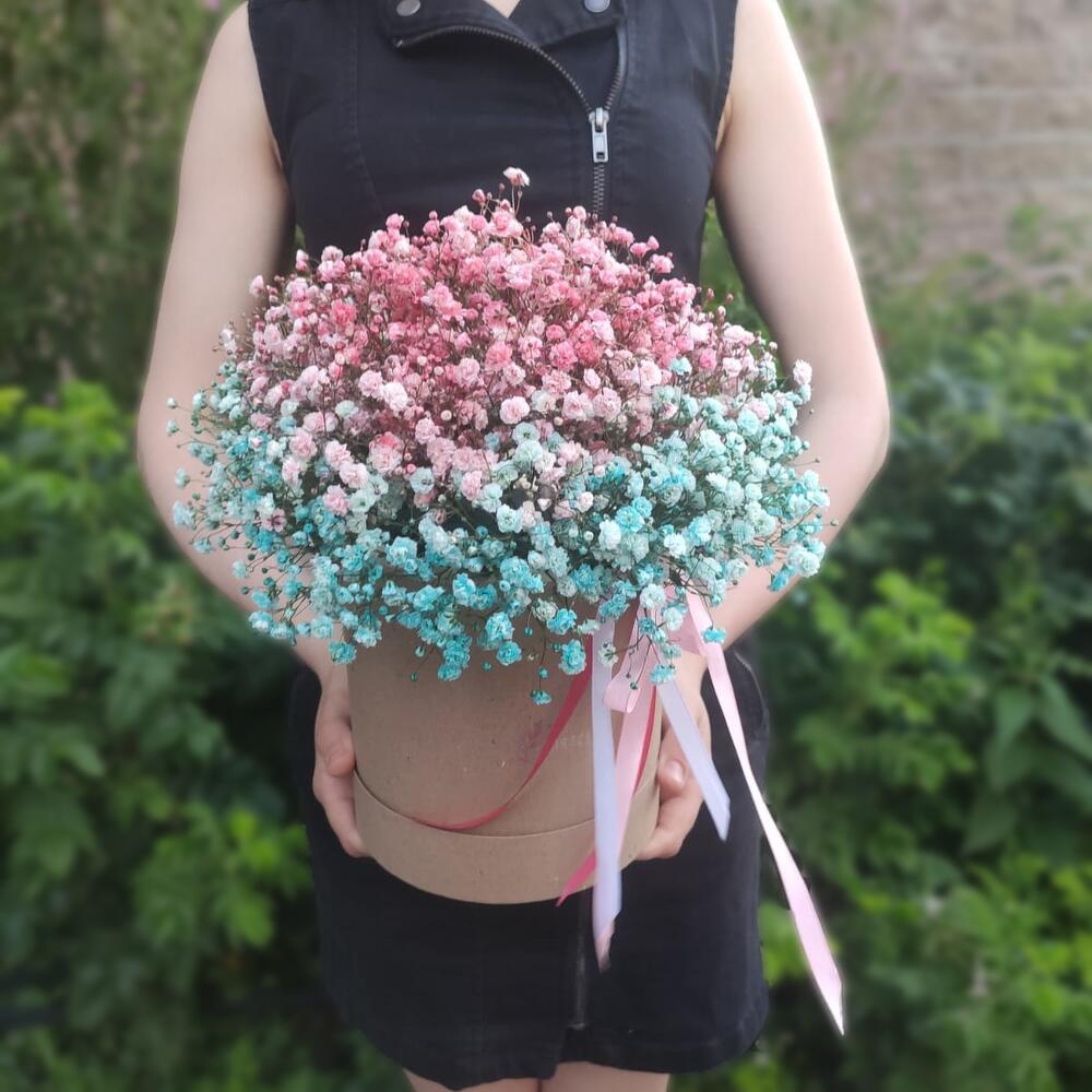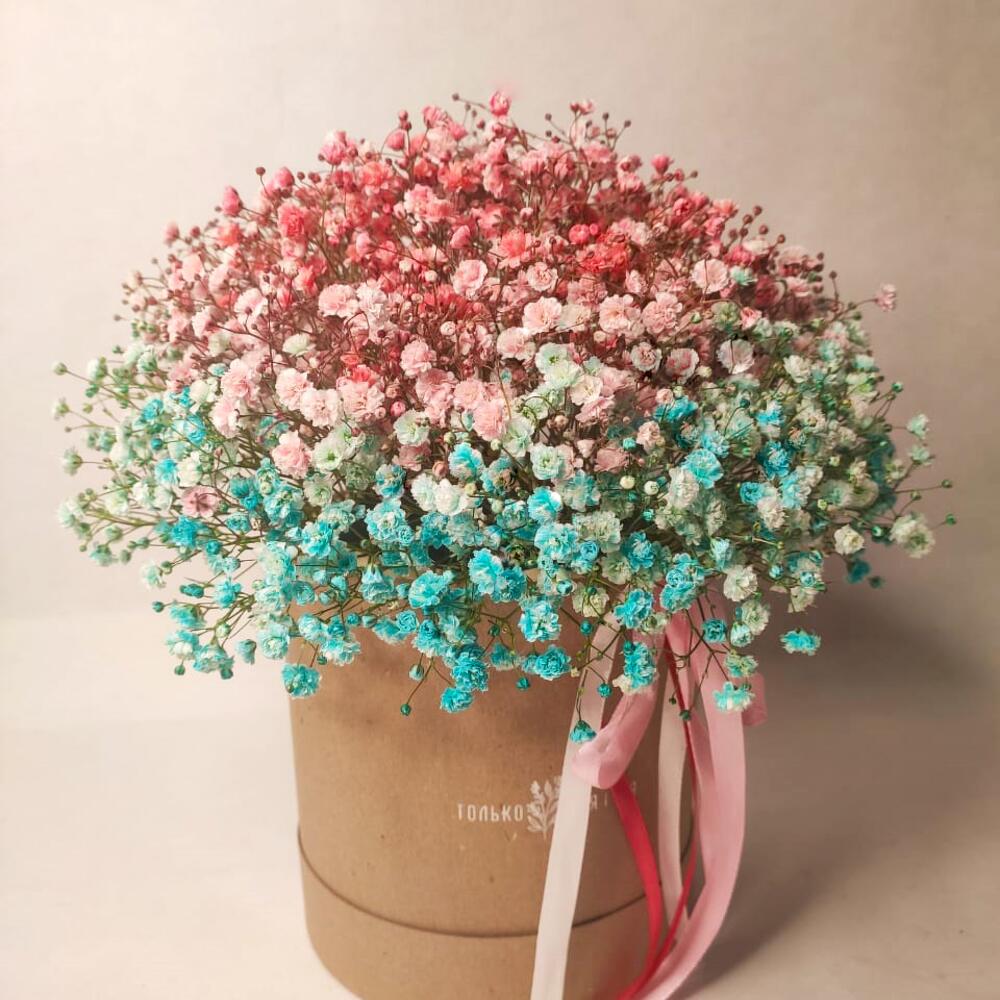 гипсофила микс – 8 шт.Шляпная коробка – 1 шт.Оазис флористический – 1 шт.