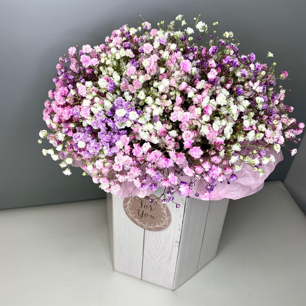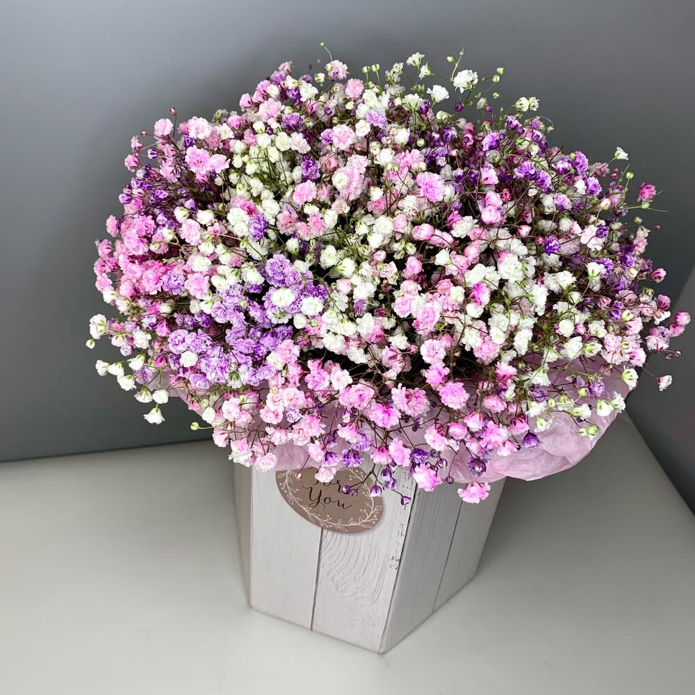 гипсофила радужная – 9 шт.Коробка шляпная – 1 шт.Оазис флористический – 1 шт.Тишью – 2 шт.Пленка прозрачная – 1 шт.Лента атласная – 2 шт.
