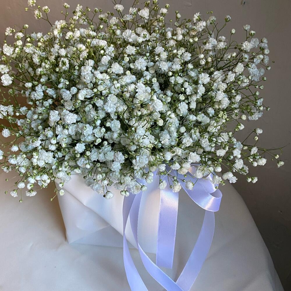“Сиреневый туман” – композиция из гипсофилы в шляпной коробке