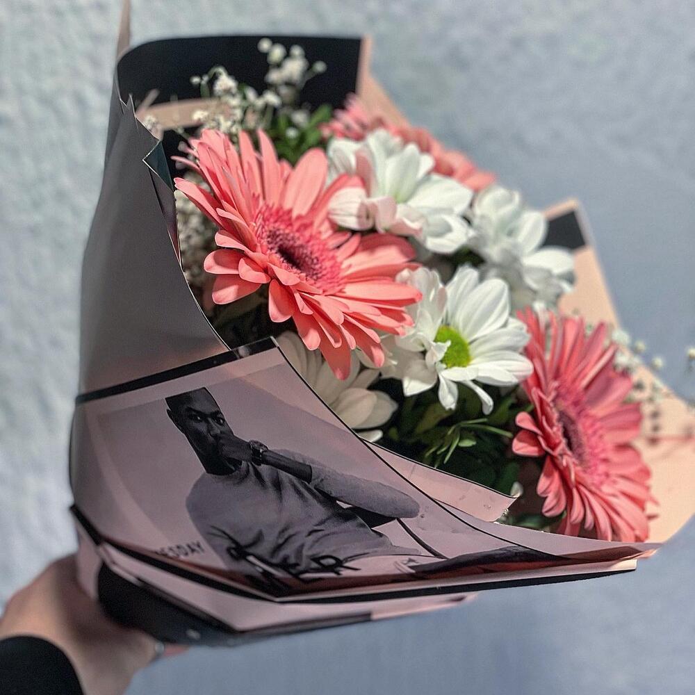 герберы – 3 шт.Хризантема кустовая – 1 шт.Гипсофила – 2 шт.фисташка зелень – 3 шт.Упаковка дизайнерская – 1 шт.