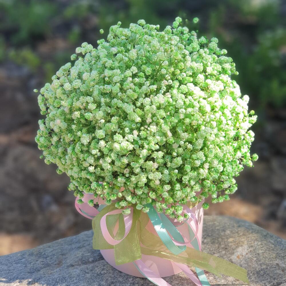 Гипсофила – 8 шт.Лента атласная – 3 шт.Коробка шляпная – 1 шт.Открыточка с вашими пожеланиями – 1 шт.Оазис флористический – 1 шт.