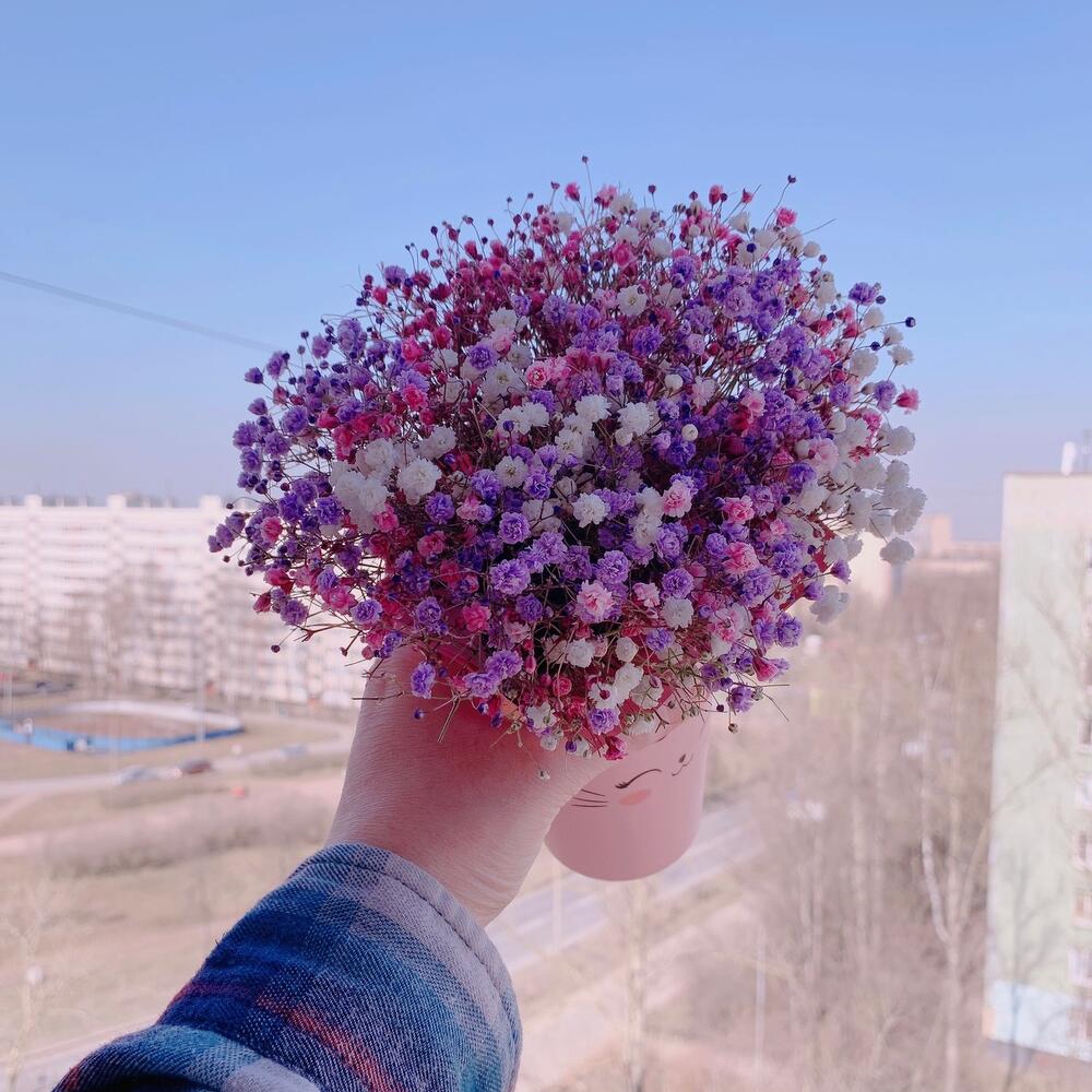 Очаровательная композиция из изысканных свежих цветов.Наполнена множеством соцветий радужной гипсофилы. Собрана в милом бумажном стакане Композиция из гипсофилы – необычный подарок, который удивит своей невероятной стойкостью, при правильном и простом уходе.❤ Ставить композицию в прохладном месте, избегая отопительных приборов и прямых солнечных лучей. ❤ Подливать немного воды в серединку. Гипсофила не вянет, а становится сухоцветом, сохраняя свой вид. Поэтому композиция продолжит радовать ещё очень долго! Почему выбирают нас? – Работаем на качество. – Бережно упакуем в транспортировочную пленку, чтобы защитить во время доставки от любых погодных условий. – Приложим инструкцию, как правильно ухаживать за цветамиСохраняйте товар в подборках, чтобы не потерять