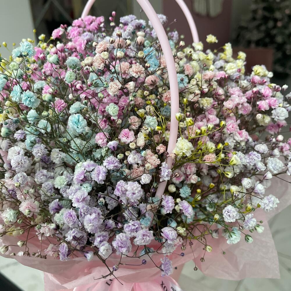 Радужная гипсофила в сумочке, цветы уже в губке с водой, очень долгостойкие, позже становятся сухоцветом и могут стоять вечно