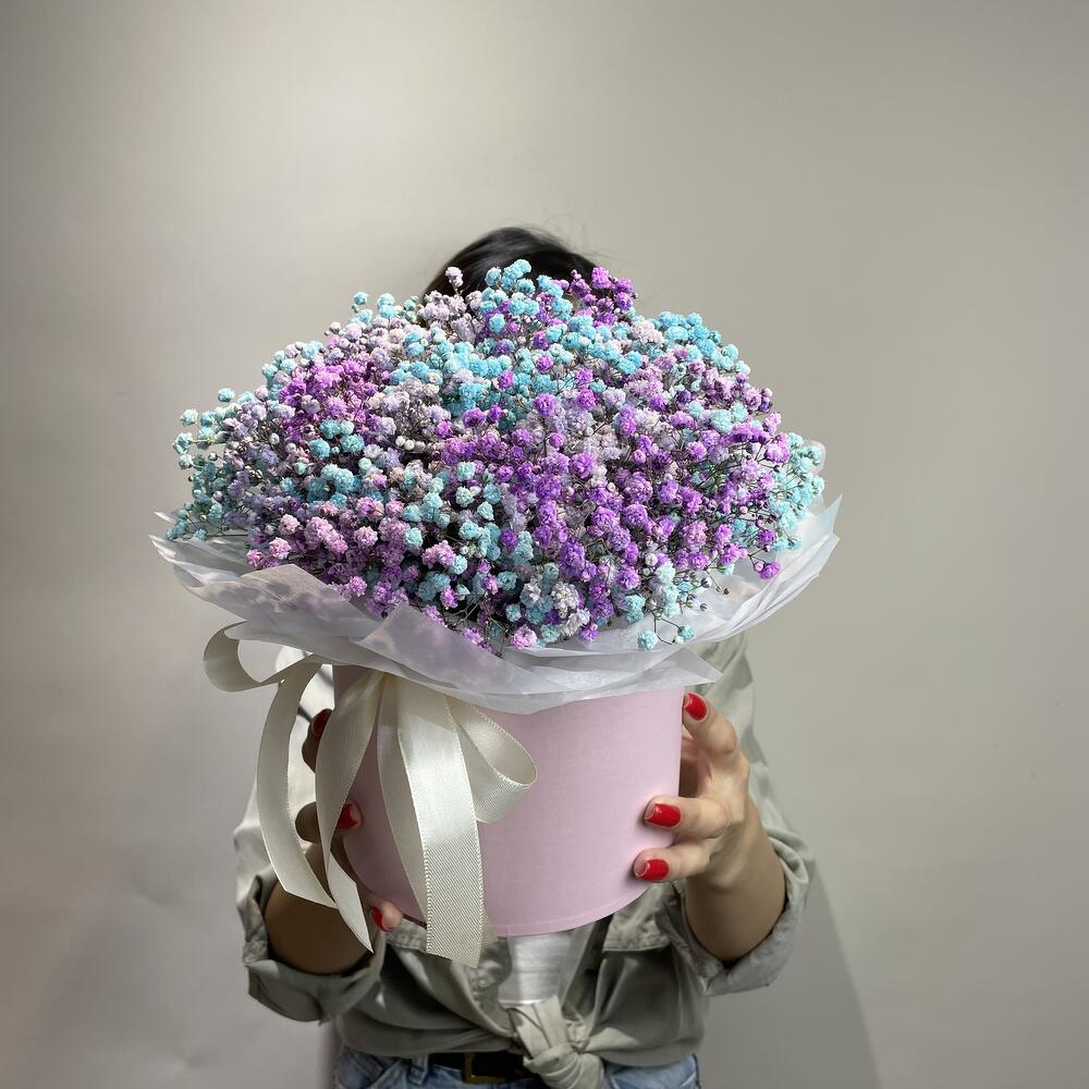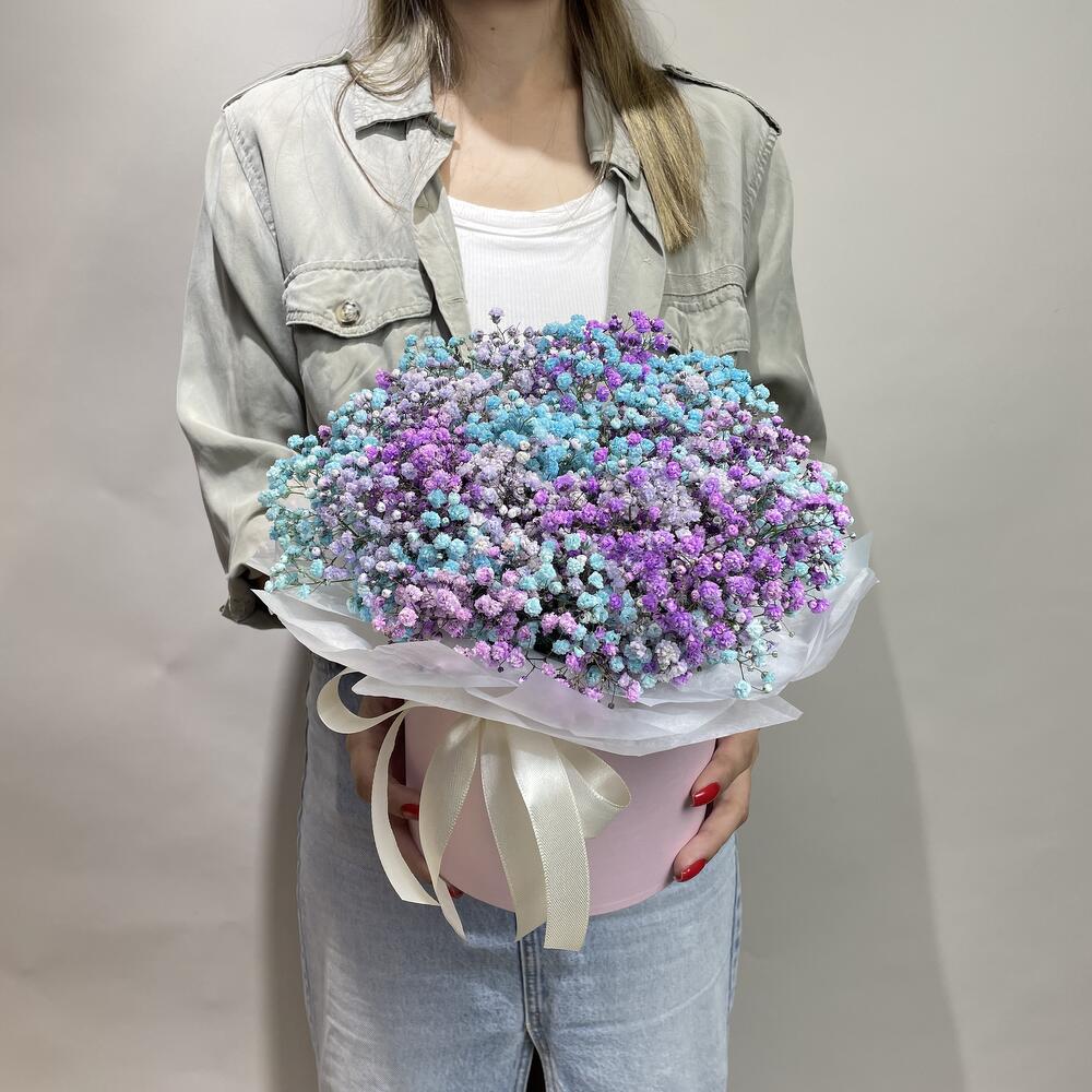 “Сиреневый туман” – композиция из гипсофилы в шляпной коробке