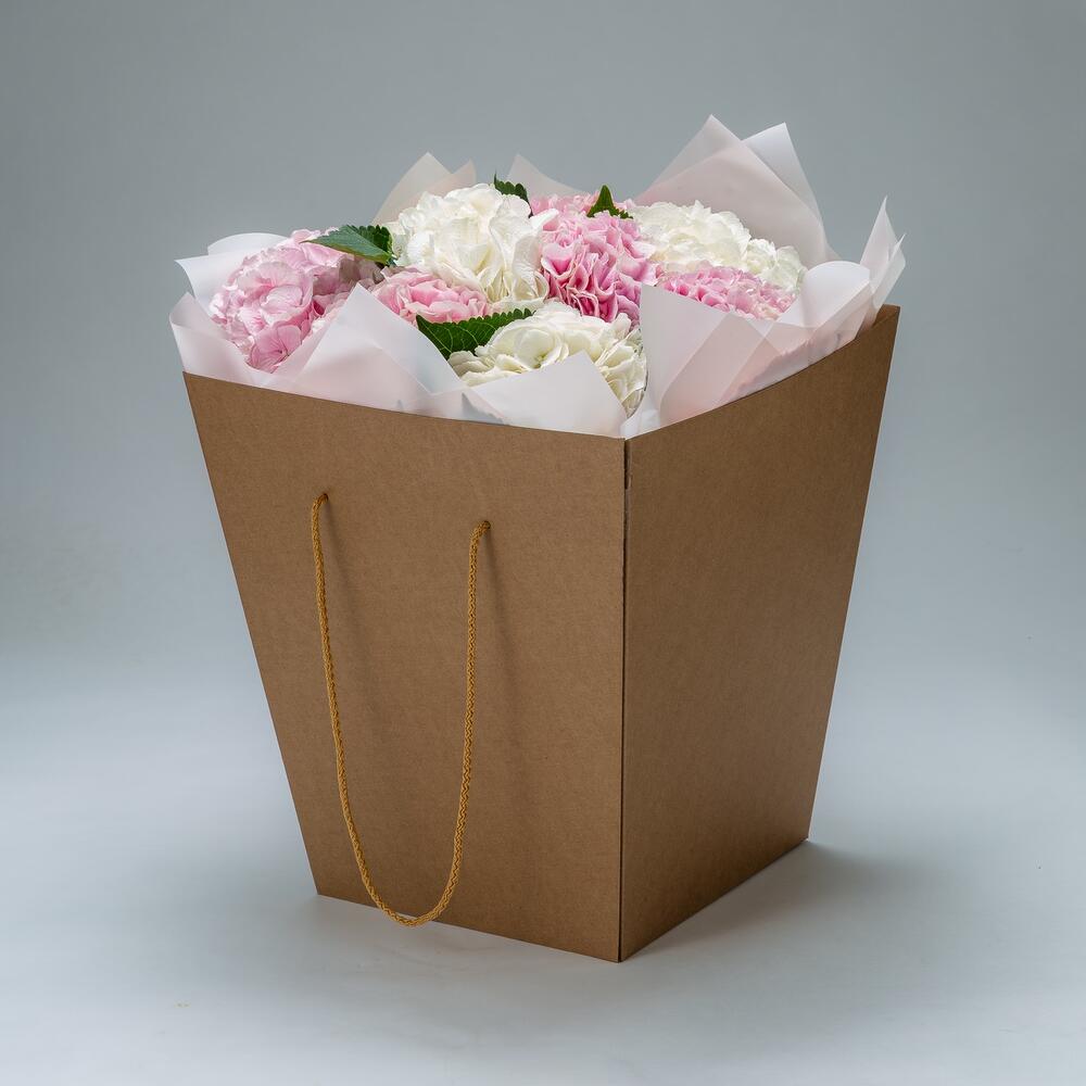 гортензия белая премиум – 5 шт.гортензия розовая премиум – 6 шт.Лента атласная – 3 шт.Коробка дизайнерская – 2 шт.хорошее настроение – 100 шт.