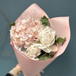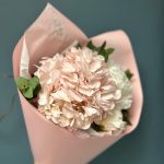 Пион – 3 шт.Эвкалипт – 2 шт.Лента атласная – 1 шт.Тишью – 2 шт.Упаковка дизайнерская – 2 шт.Гортензия розовая – 1 шт.