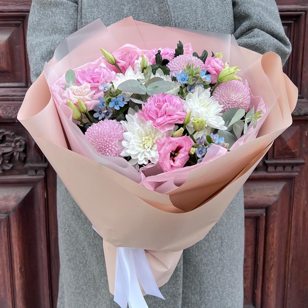 эустома розовая махровая – 1 шт.Оксипеталум – 3 шт.Хризантема момоко – 3 шт.Хризантема кустовая – 2 шт.Диантус – 3 шт.Эвкалипт – 1 шт.Тишью – 1 шт.Пленка матовая – 5 шт.Лента атласная – 2 шт.