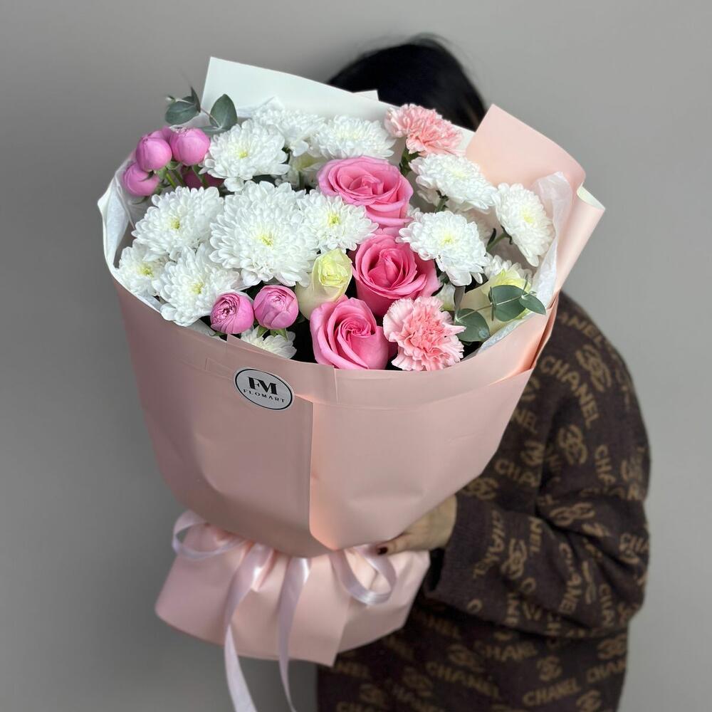 Альстромерии, Гвоздики, Кустовые розы, Лизиантусы, Розы, Хризантемы