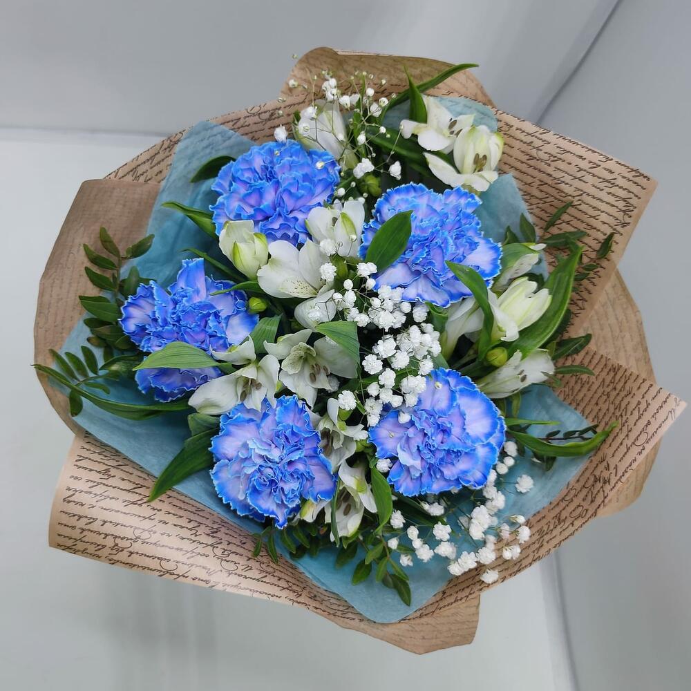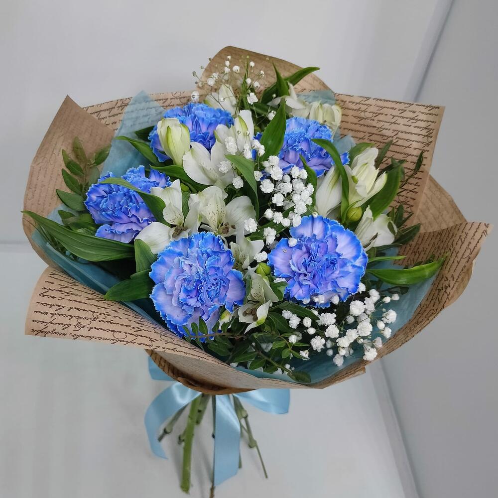 Букет из 5 Диантусов голубых, Альстромерии и Гипсофилы