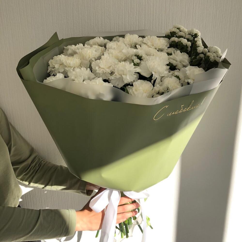 Статица белая – 5 шт.Диантус белый – 25 шт.Дизайнерская упаковка – 1 шт.индивидуальная надпись – 1 шт.ленты атласные – 3 шт.