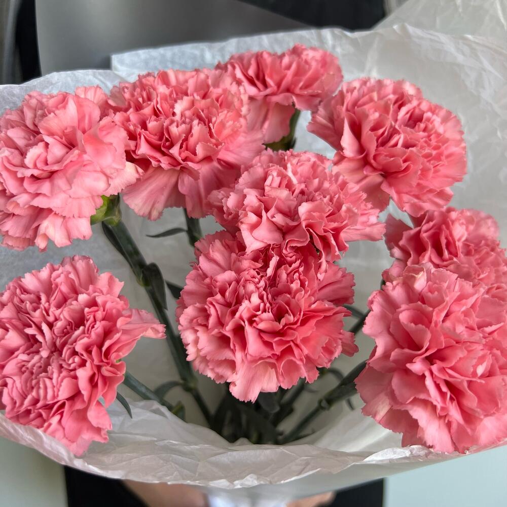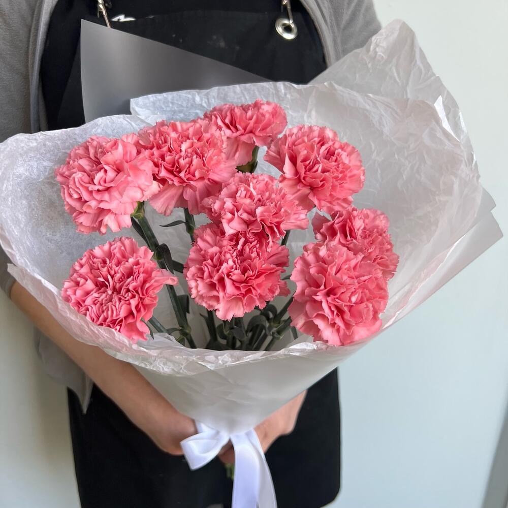 Лента атласная – 1 шт.Диантус – 9 шт.Матовая пленка – 2 шт.Тишью белое – 2 шт.