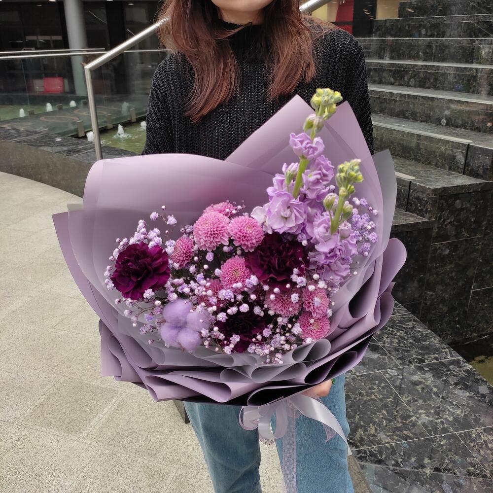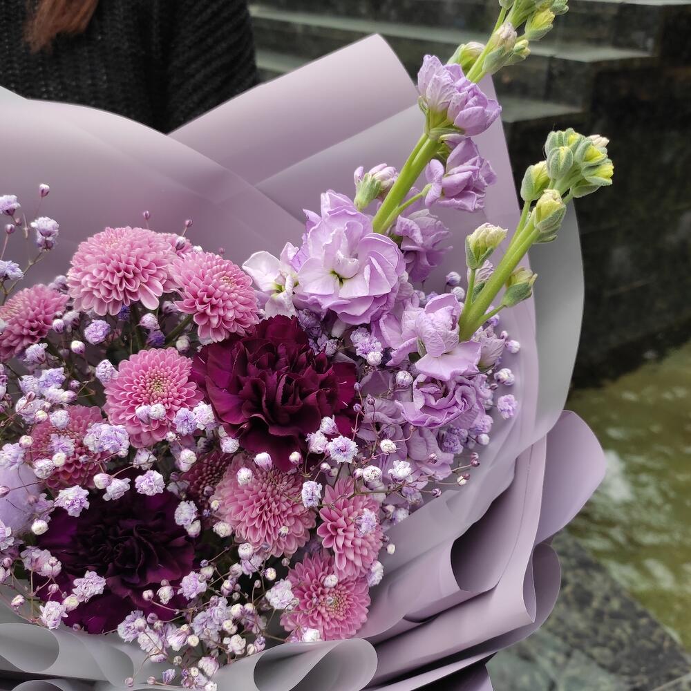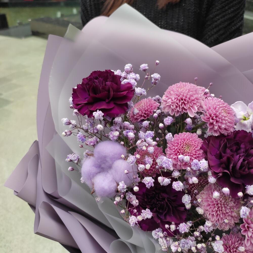 Гвоздика – 3 шт.Хризантема кустовая – 2 шт.Маттиола – 2 шт.Хлопок – 1 шт.Гипсофила – 2 шт.Лента – 2 шт.Упаковка дизайнерская – 2 шт.
