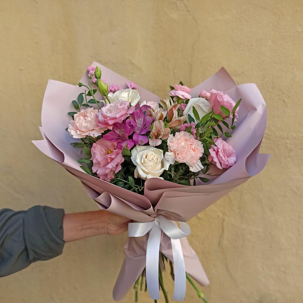 Категории: АльстромерииРозы, Гвоздики, Лизиантусы