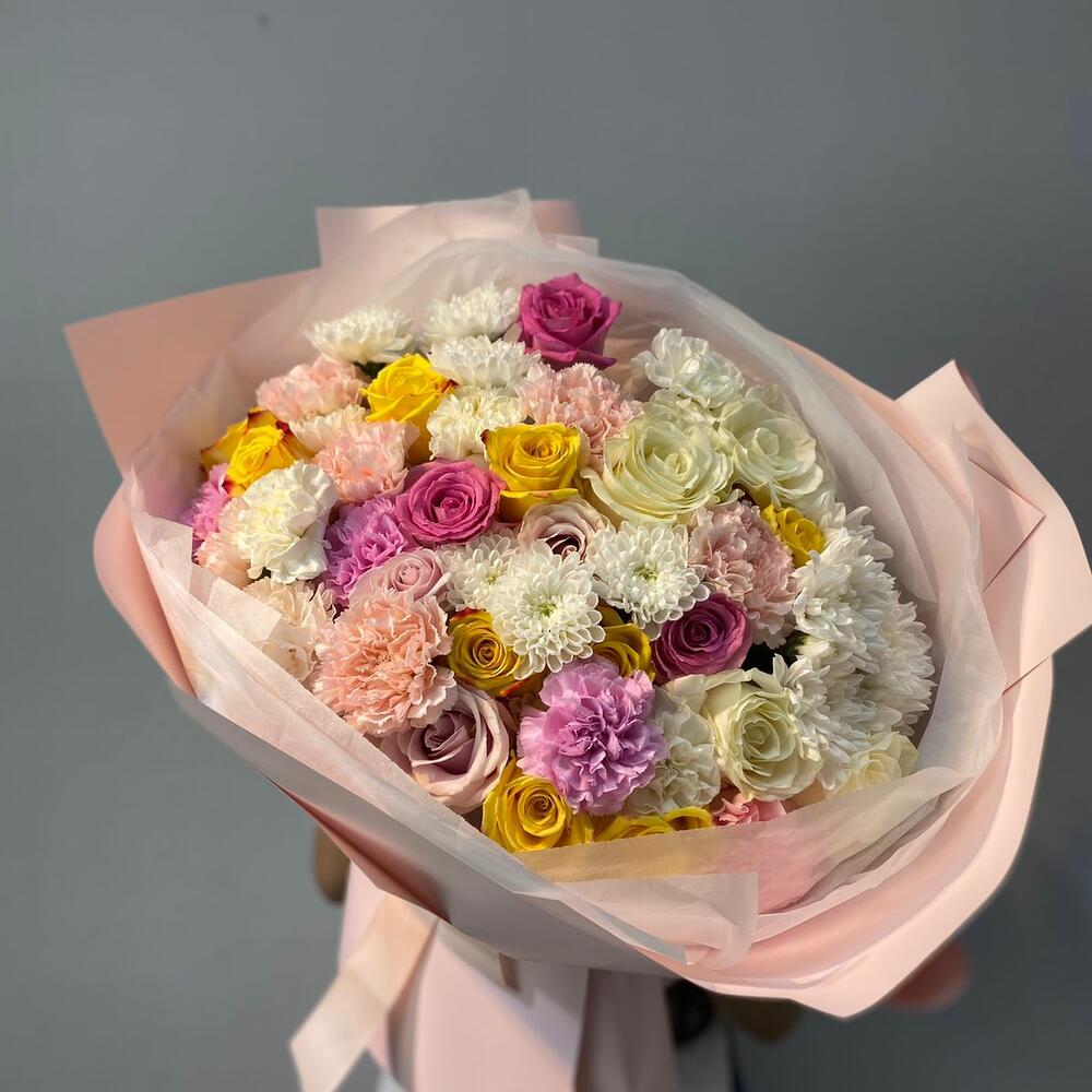 Гвоздики, Лизиантусы, Розы, Тюльпаны