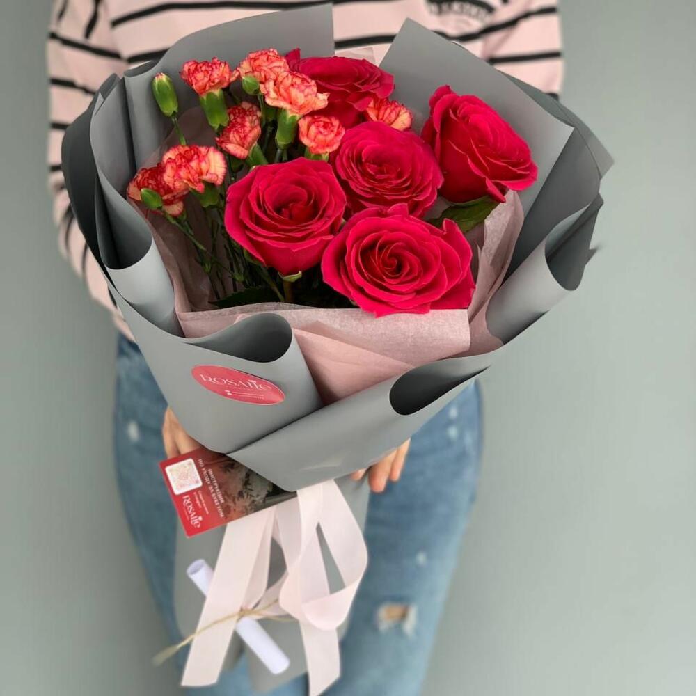 Альстромерии, Гвоздики, Кустовые розы, Лизиантусы, Розы, Хризантемы