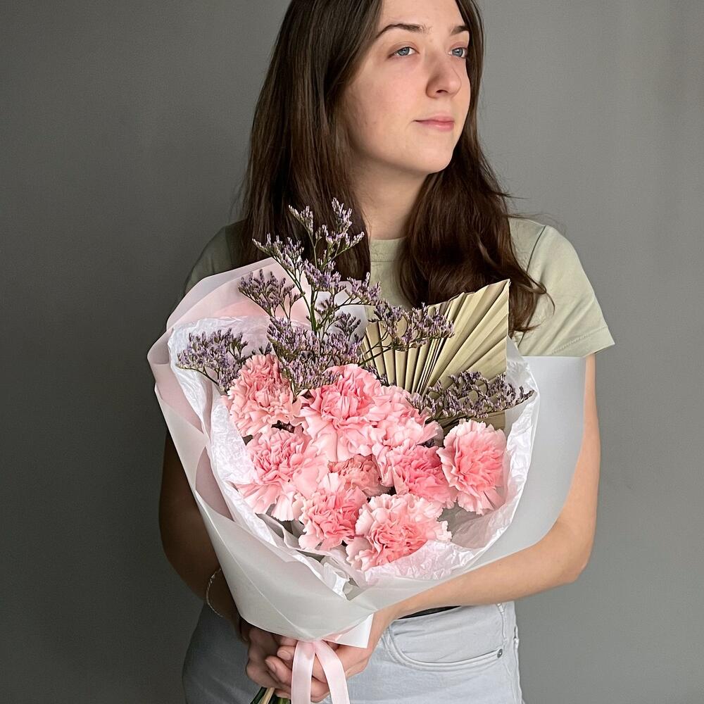 Лента – 1 шт.Лимониум – 1 шт.Гвоздика – 9 шт.Дизайнерская упаковка – 1 шт.пальма пика сухоцвет – 1 шт.