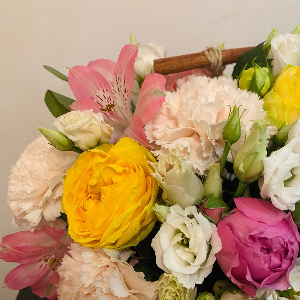 Гвоздики, Лизиантусы, Розы, Тюльпаны
