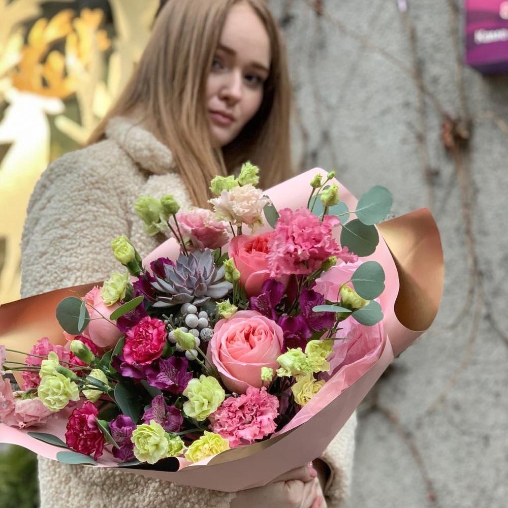 суккулент (эйхеверия) – 1 шт.Роза пионовидная – 3 шт.Лизиантус – 3 шт.Альстромерия – 3 шт.Гвоздика – 4 шт.Гвоздика кустовая – 4 шт.Бруния – 1 шт.Фисташка – 5 шт.Эвкалипт – 1 шт.Упаковка дизайнерская – 2 шт.Лента атласная – 1 шт.