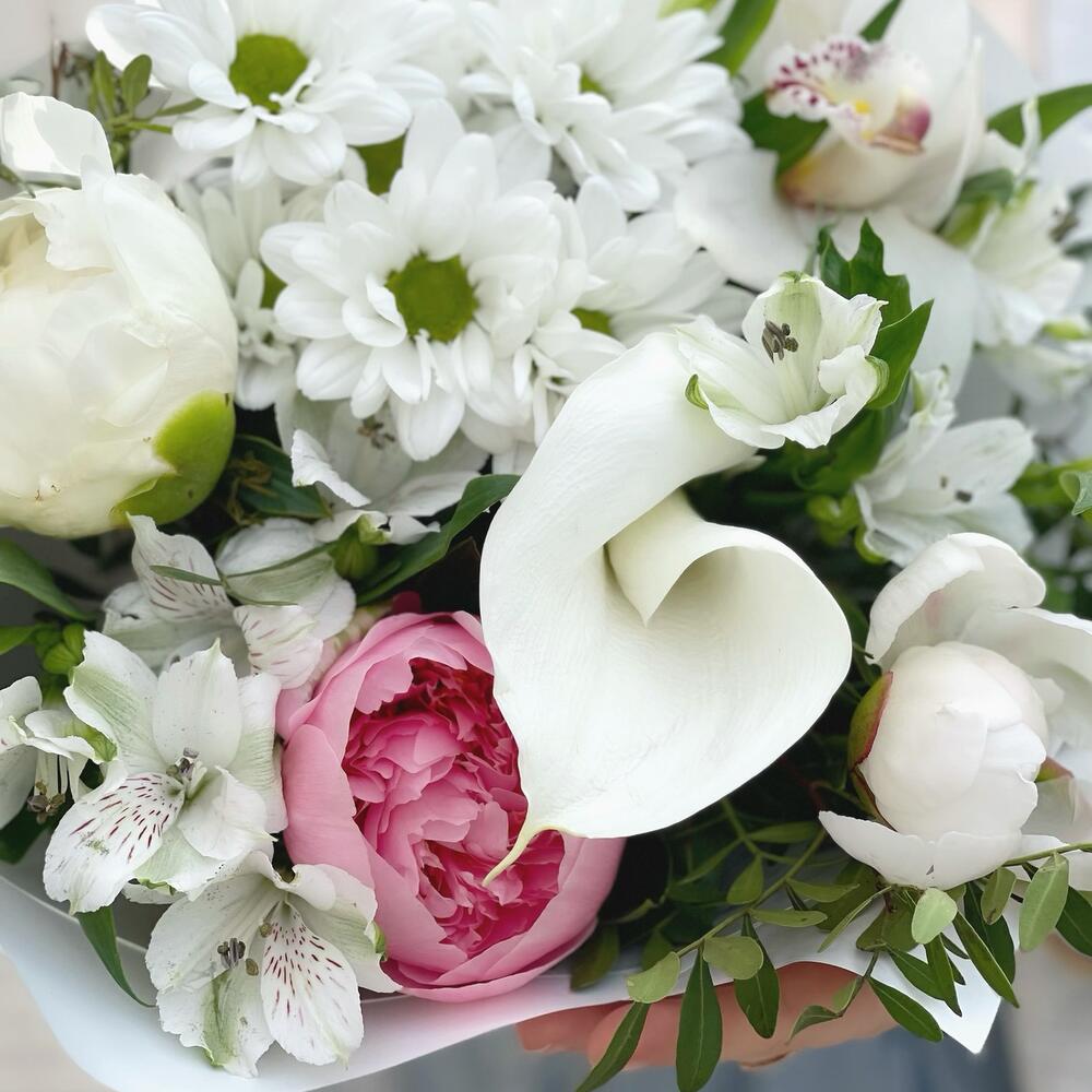 Альстромерия – 2 шт.Лента – 1 шт.Пион – 3 шт.Хризантема кустовая – 1 шт.орхидея – 1 шт.Упаковка дизайнерская – 1 шт.Фисташка пучок – 1 шт.каллы белые – 1 шт.