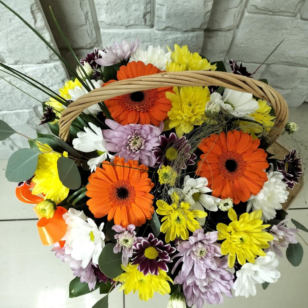 Эвкалипт – 2 шт.Лента атласная – 1 шт.Гербера мини – 3 шт.Оазис флористический – 1 шт.Хризантема кустовая микс – 5 шт.корзина плетенная средняя – 1 шт.Паникум Фонтан – 1 шт.