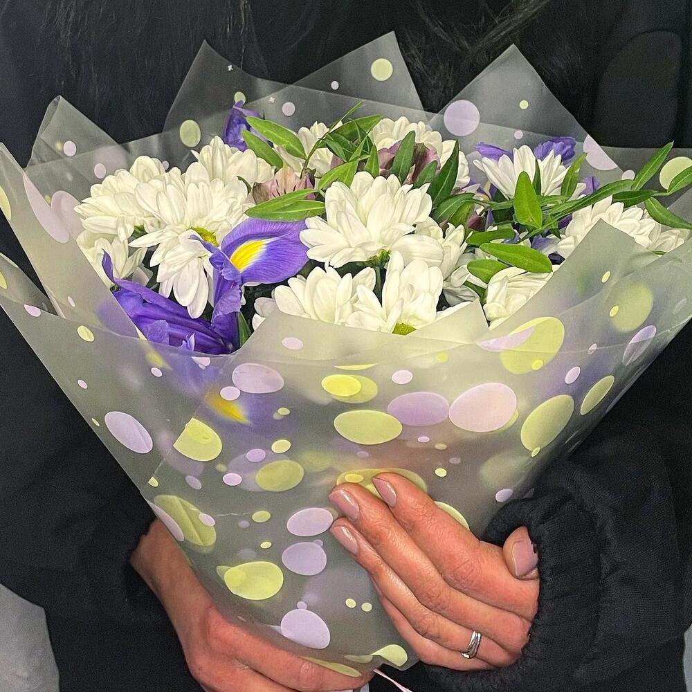 Хризантема кустовая – 4 шт.Альстромерия – 1 шт.Ирис – 4 шт.фисташка зелень – 3 шт.Упаковка – 1 шт.