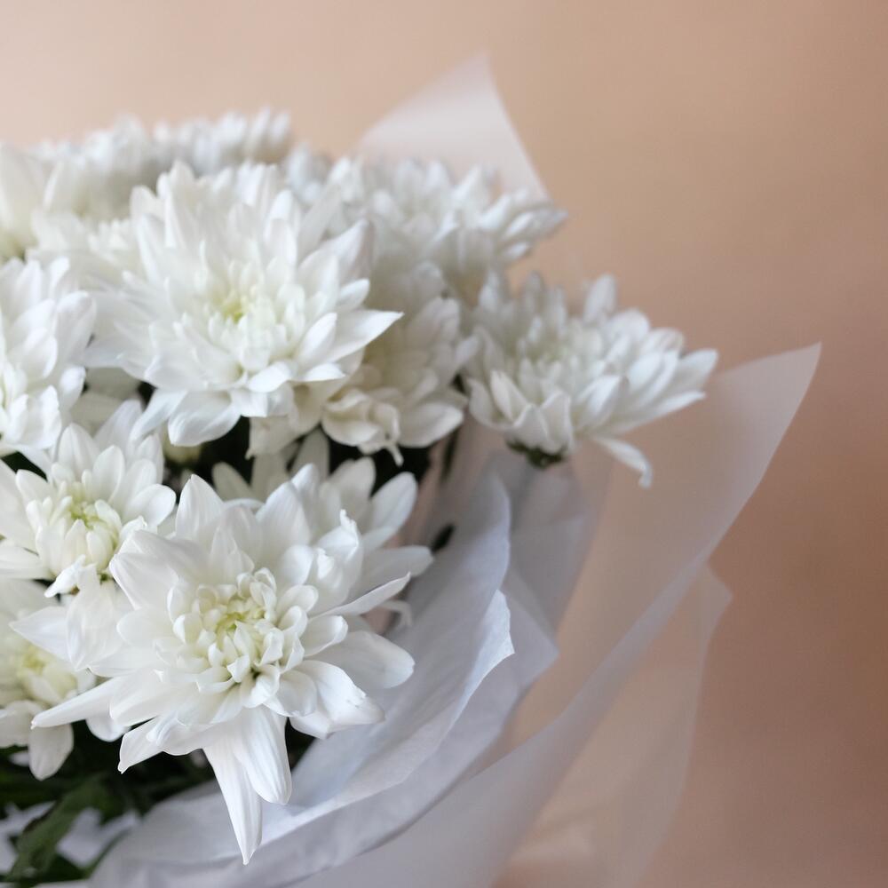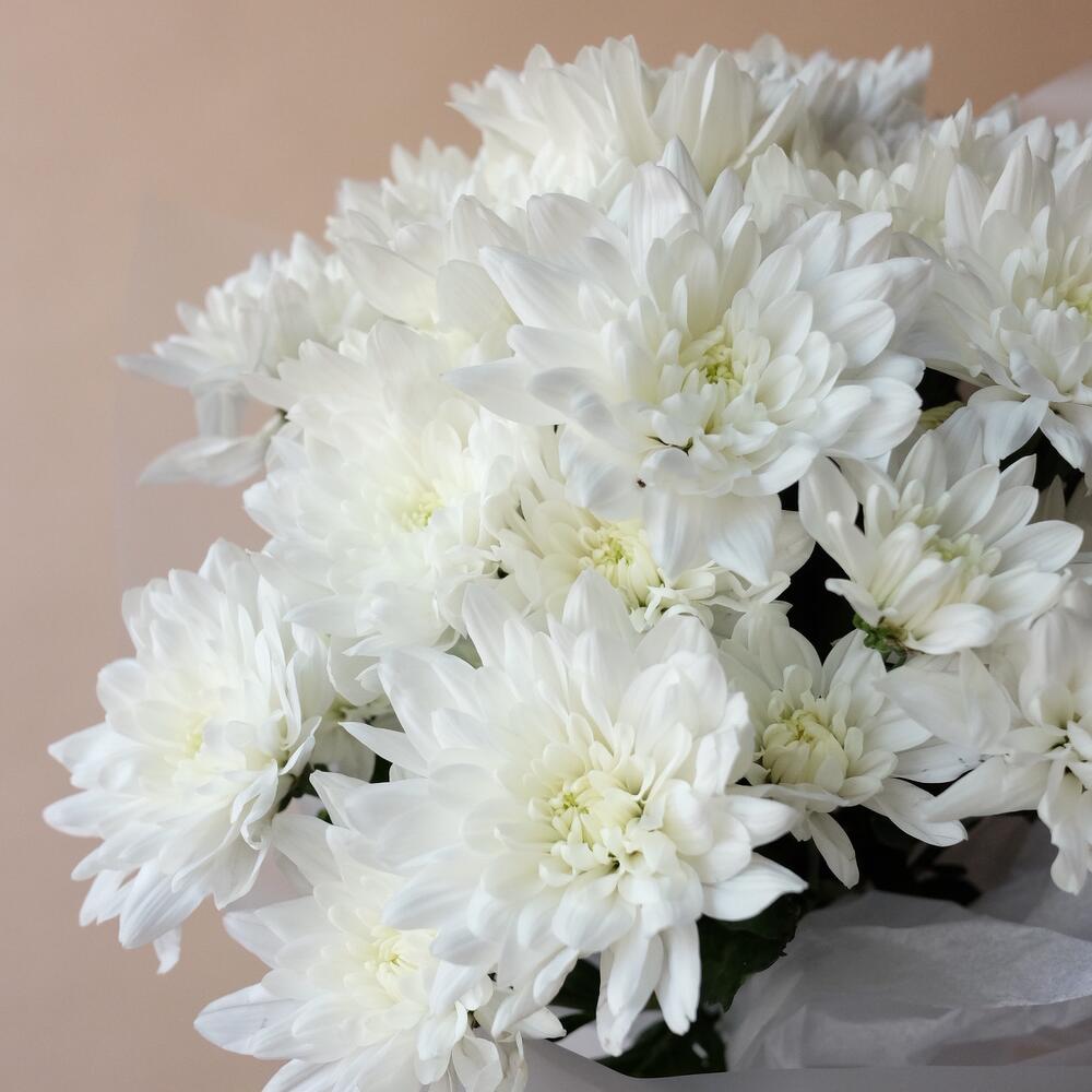 Хризантема кустовая – 5 шт.Лента атласная – 1 шт.Упаковка дизайнерская – 1 шт.Открыточка с вашими пожеланиями – 1 шт.