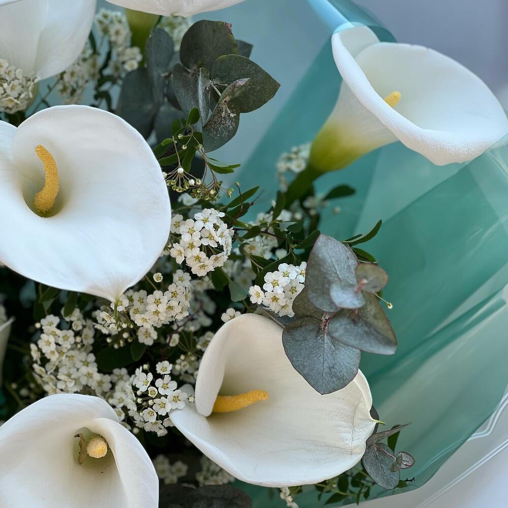 Калла – 11 шт. Лента – 1 шт. Берграсс – 1 шт. Хамелациум – 5 шт. Упаковка дизайнерская – 8 шт.