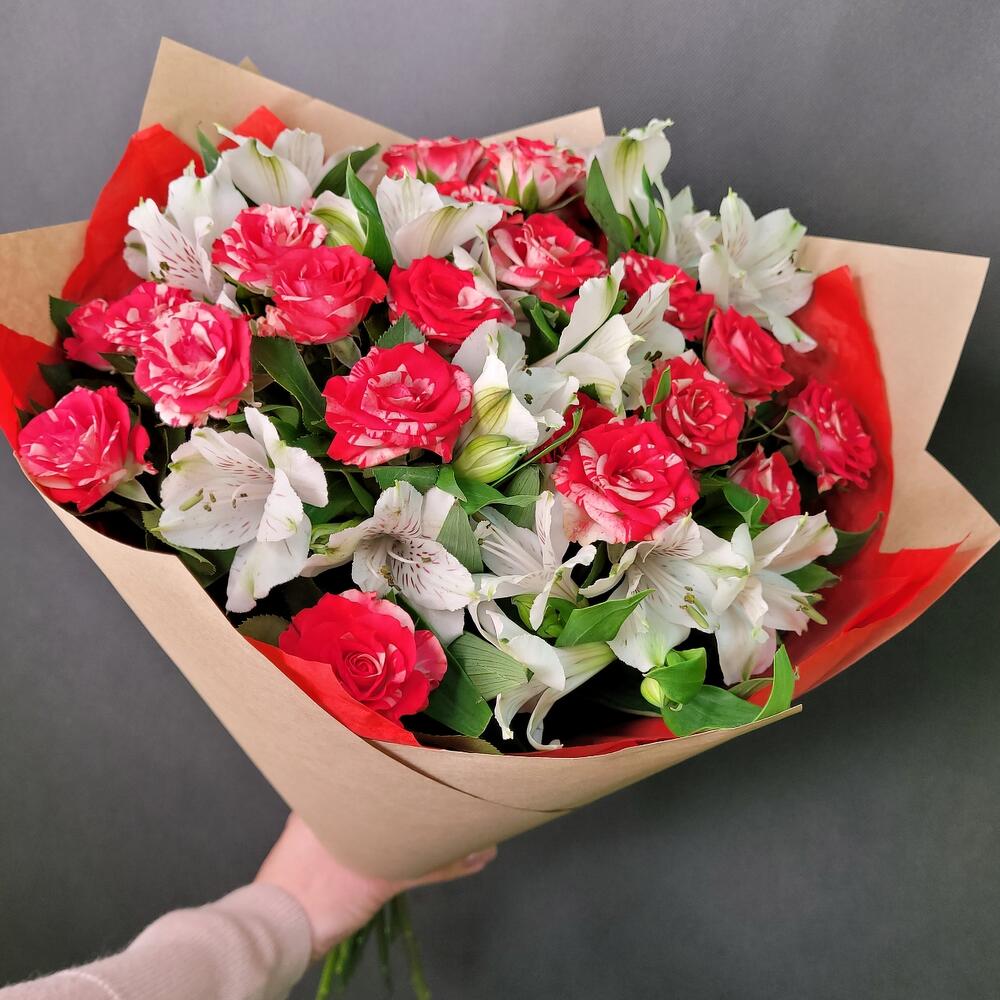 Роза кустовая – 3 шт.Альстромерия – 5 шт.Тишью – 2 шт.Крафт – 2 шт.
