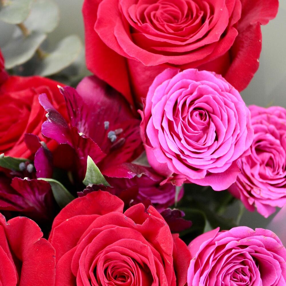 Роза Эквадор – 5 шт.Роза кустовая – 1 шт.Альстромерия – 2 шт.Эвкалипт – 1 шт.Упаковка дизайнерская – 2 шт.