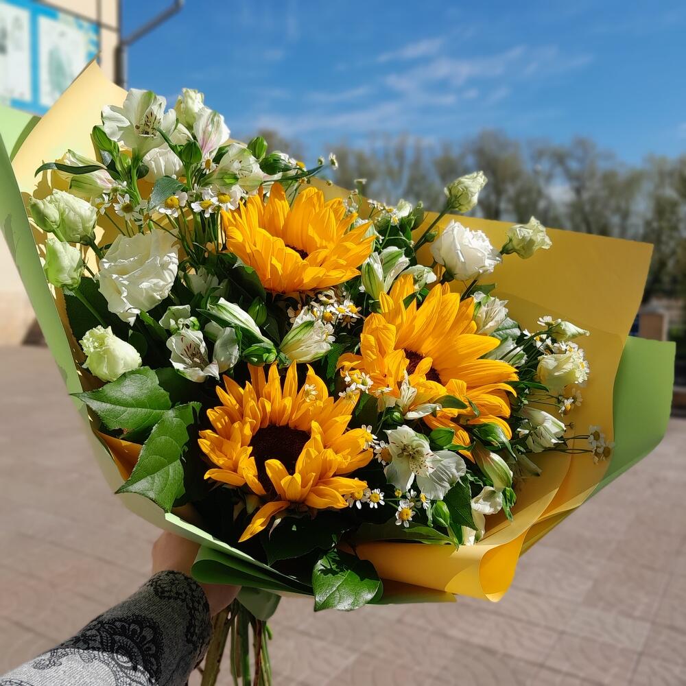 Подсолнух – 3 шт.Эустома – 2 шт.Матрикария (Ромашка Камила) – 5 шт.Альстромерия – 6 шт.Салал – 7 шт.Упаковка дизайнерская – 3 шт.Лента атласная – 2 шт.