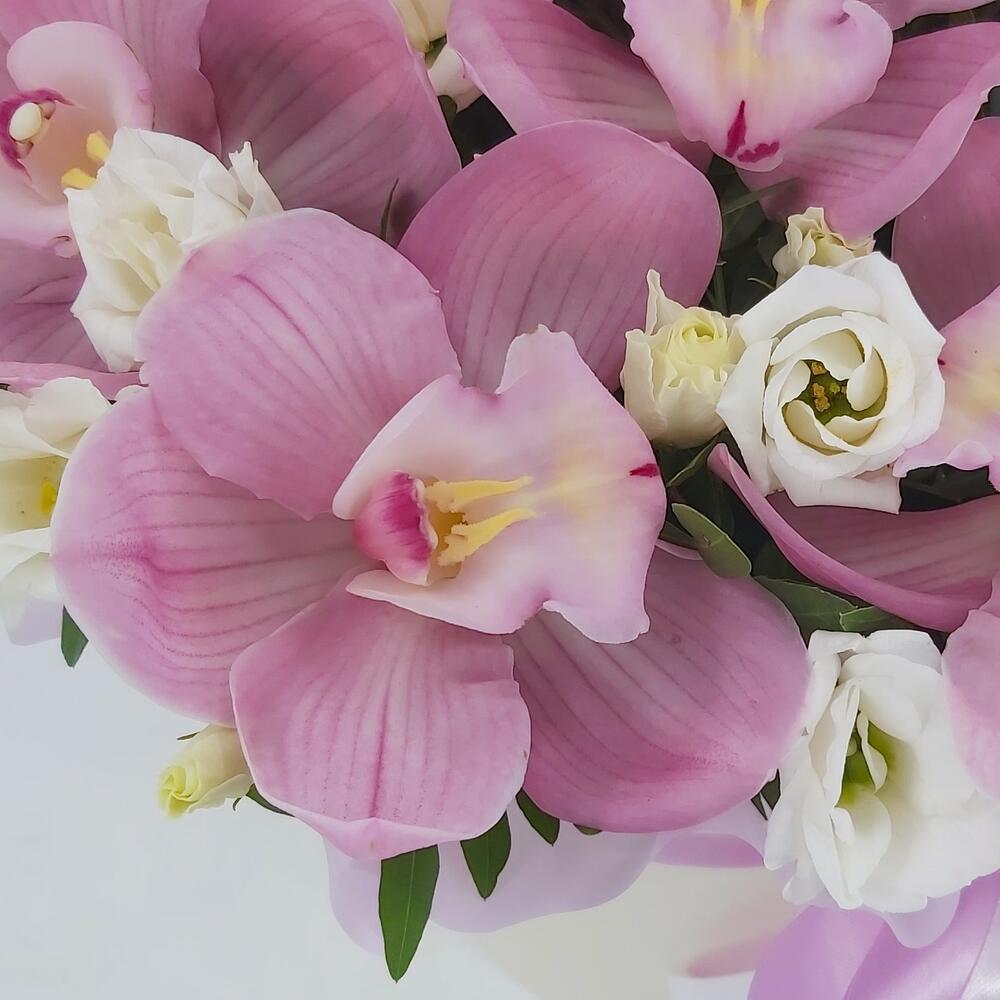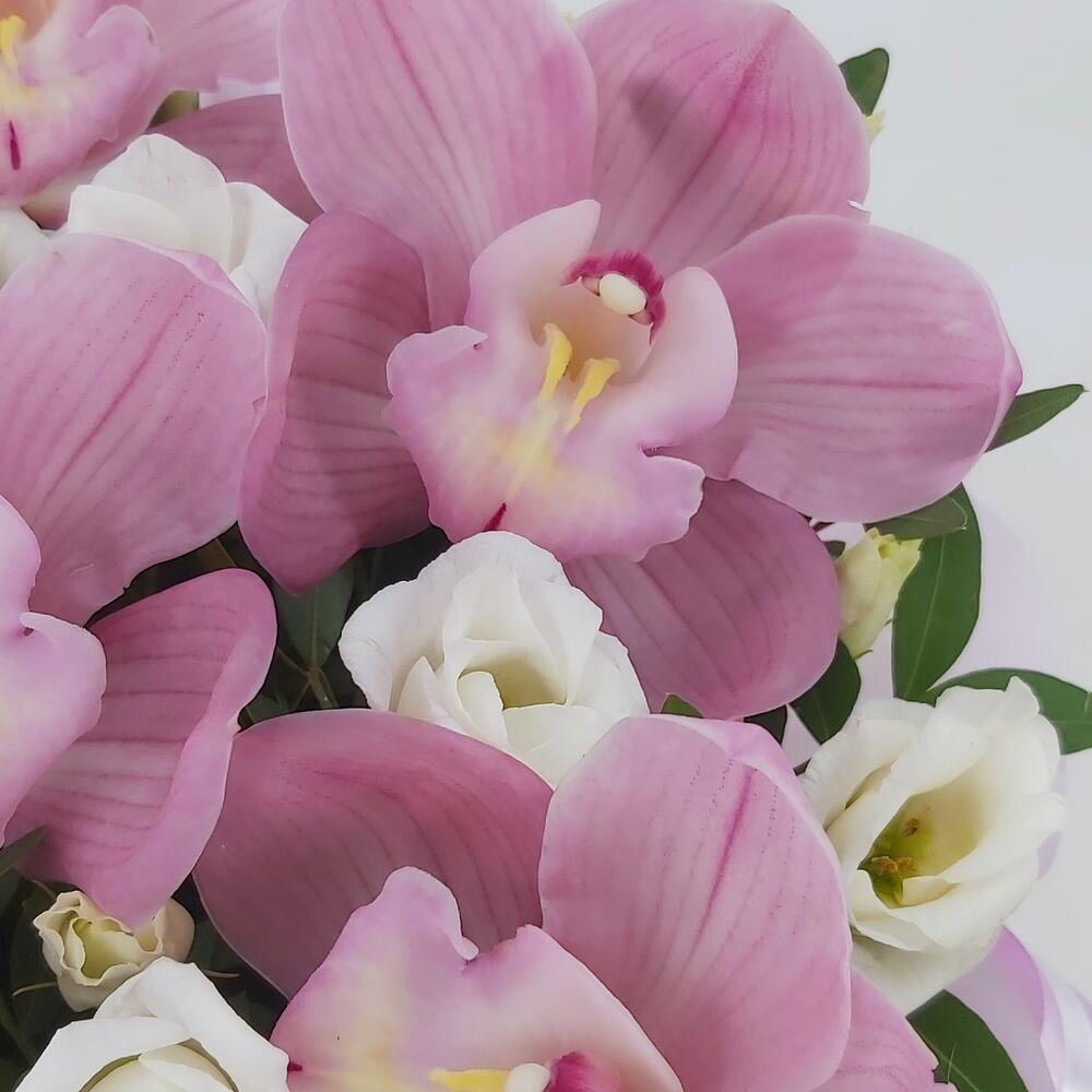 Орхидея цимбидиум бутон – 7 шт.Эустома – 3 шт.Пистация – 3 шт.Коробка цилиндр – 1 шт.Пленка матовая – 1 шт.Лента атласная – 1 шт.Флористическая губка (оазис) – 1 шт.