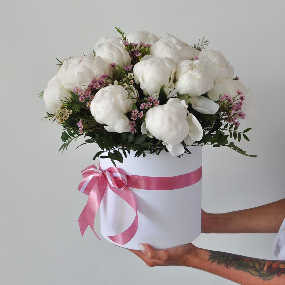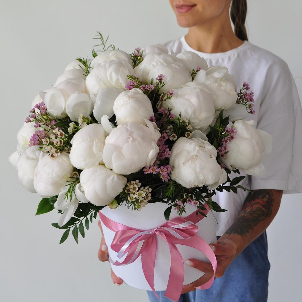 Коробка шляпная – 1 шт.Хамелациум – 3 шт.Пион белый – 25 шт.Оазис флористический – 2 шт.зелень декоративная – 6 шт.