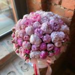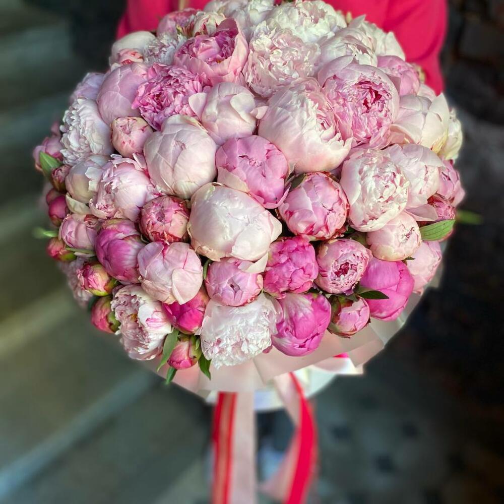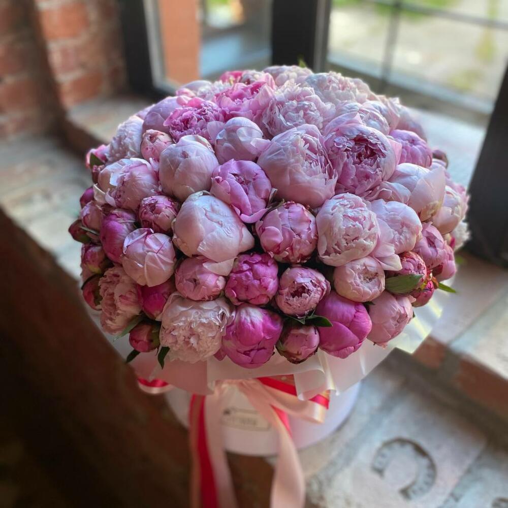 Букет из 101 розового пиона в дизайнерской коробке “Мадам Баттерфляй”