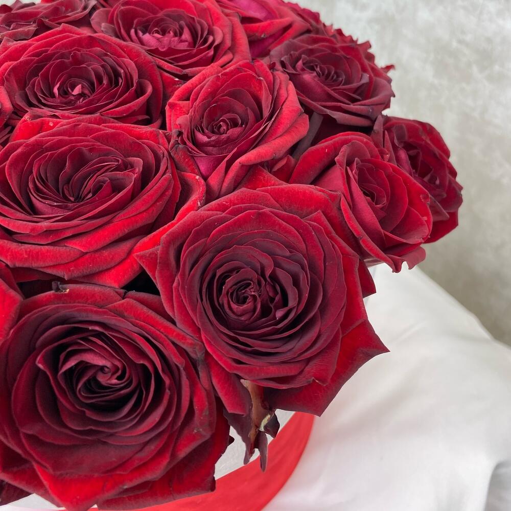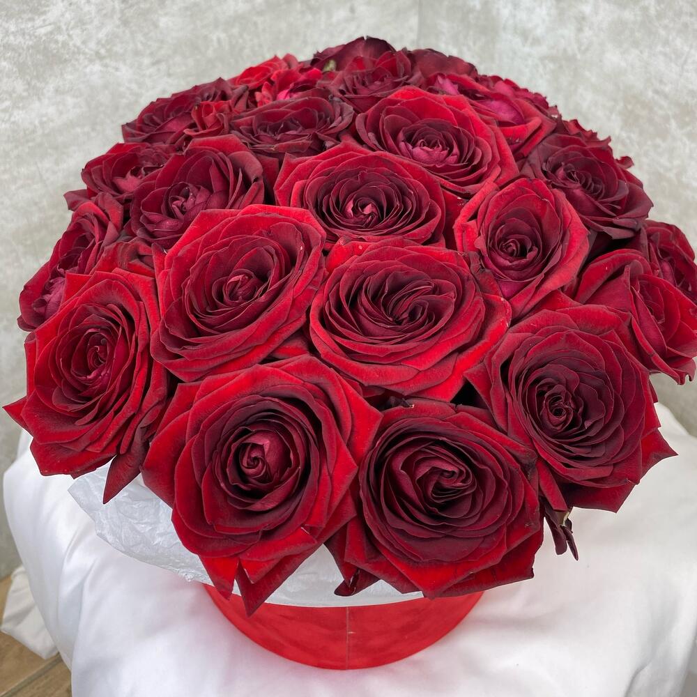 27 элитных роз в шляпной бархатной коробке
