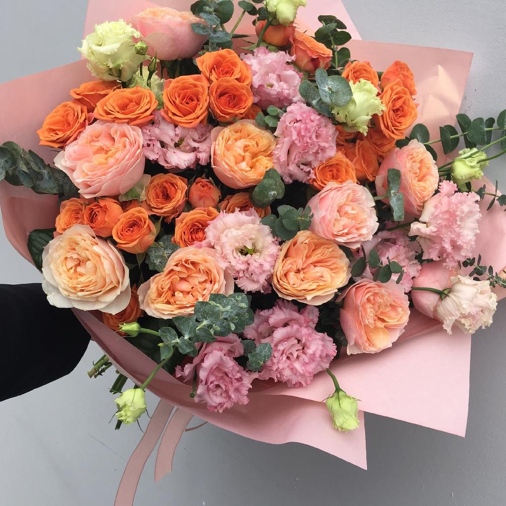 Гвоздики, Лизиантусы, Розы, Тюльпаны