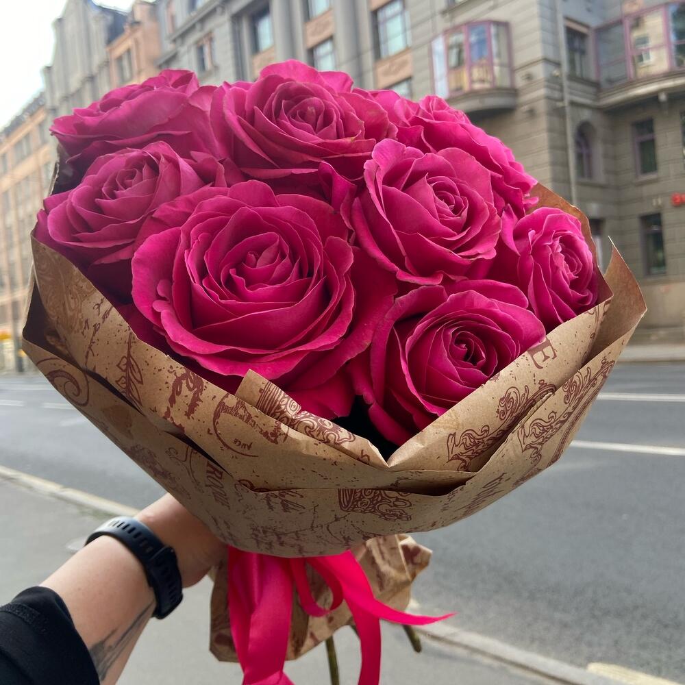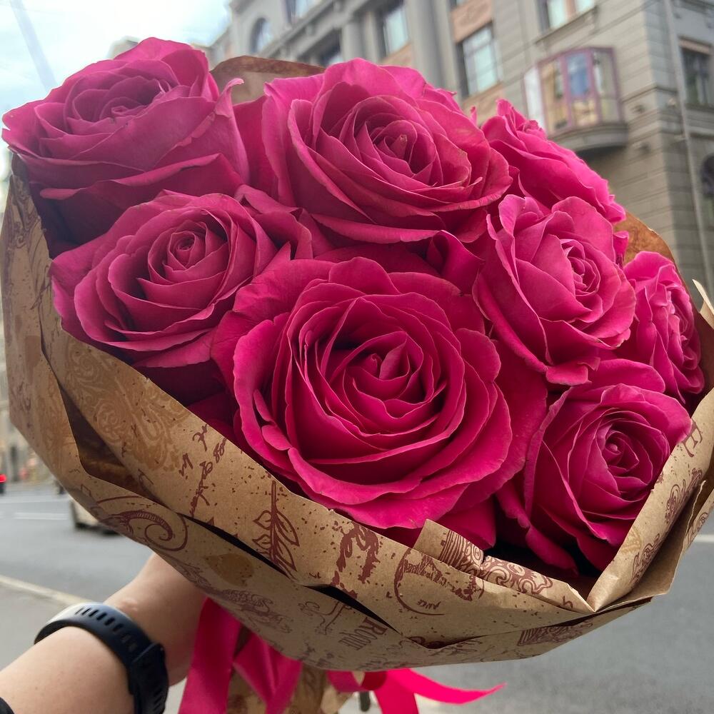 роза пинк флойд(7) – 9 шт.Упаковка дизайнерская – 1 шт.Лента атласная – 1 шт.