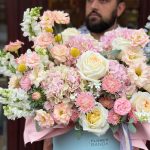 Авторская композиция из гортензий, роз и ранункулюсов в шляпной коробке