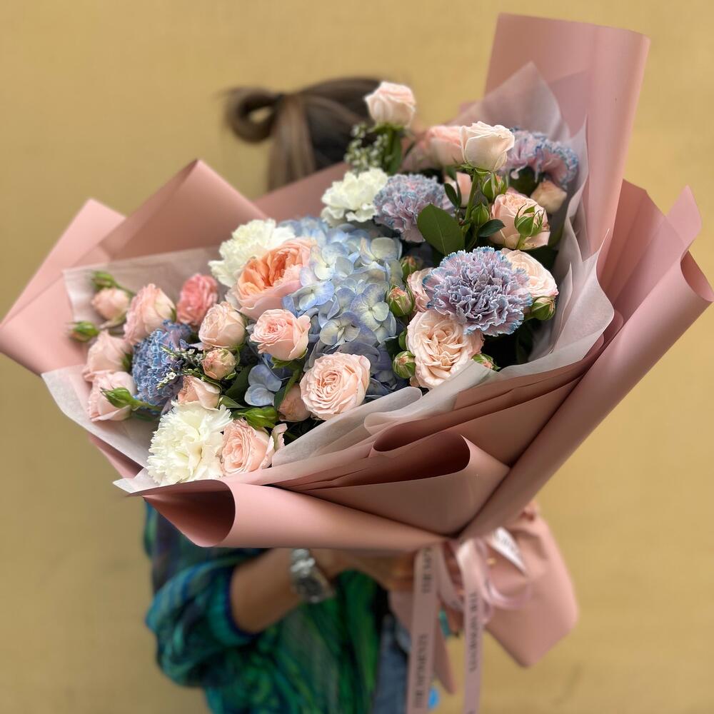 Гвоздики, Кустовые розы, Лизиантусы, Пионовидные розы, Розы