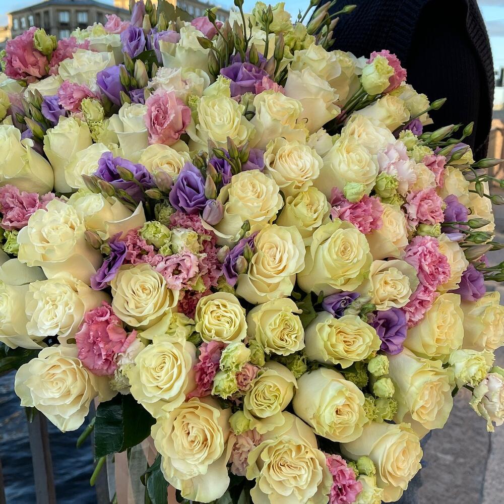 роза одноголовая мондиаль – 51 шт.эустома махровая микс – 30 шт.Лента атласная – 3 шт.