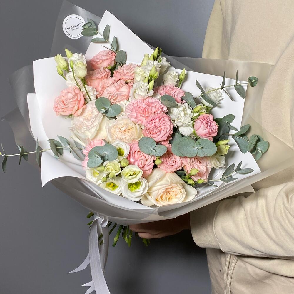 Эвкалипт – 5 шт.Лента атласная – 1 шт.Диантус белый – 2 шт.Диантус розовый – 3 шт.Матовая пленка – 2 шт.Корейская упаковка – 2 шт.лизиантус росита вайт – 3 шт.роза white o’hara – 3 шт.кустовая роза madame bombastic – 2 шт.