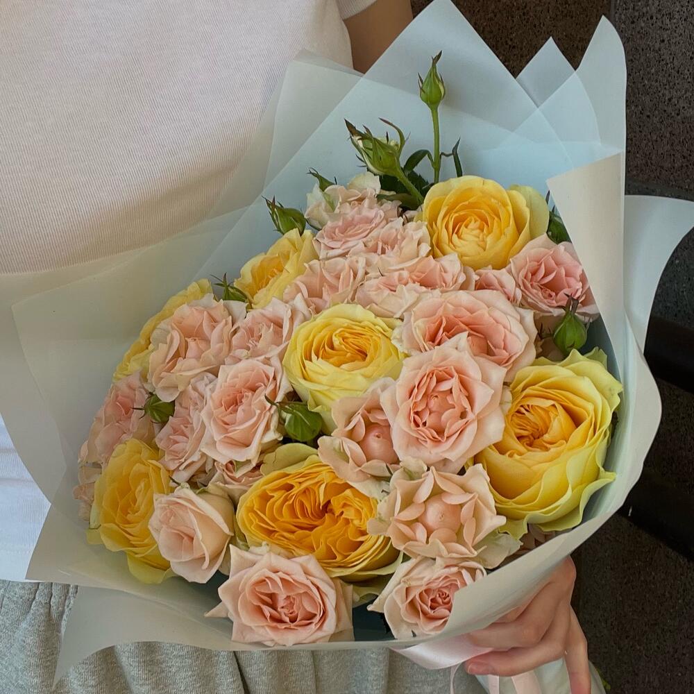Лента – 1 шт.Роза кустовая – 8 шт.Упаковка дизайнерская – 1 шт.роза батеркап – 7 шт.