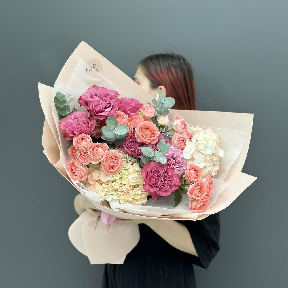 Гвоздики, Кустовые розы, Лизиантусы, Пионовидные розы, Розы