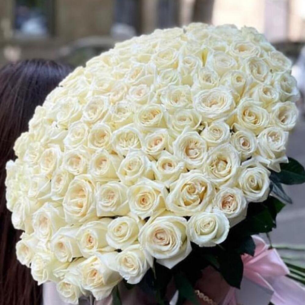 Роза белая – 101 шт.Лента атласная – 2 шт.Открыточка с вашими пожеланиями – 1 шт.хорошее настроение – 100 шт.инструкция по уходу за цветами – 1 шт.коробка переноска – 1 шт.Кризал – 1 шт.