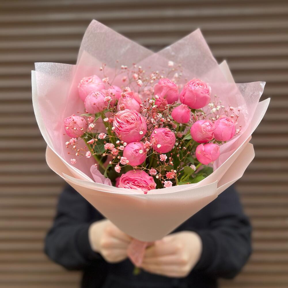 Букет из пион розы и гипсофилы