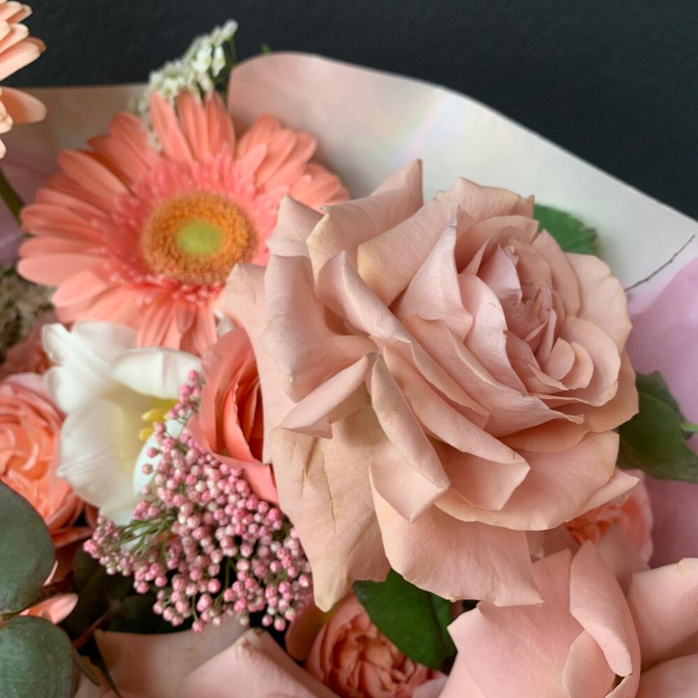 Букет из пионовидной розы, гербер и тюльпана «Сладкий поцелуй